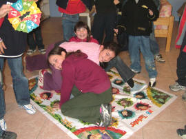 14 h 00 - Bon, reprenons ! Hier après-midi, donc, pour la classe de CP-CE1, et pour les CE2, promenade dans la forêt landaise : petite cueillette, découverte des arbres et arbustes locaux... Pour les CM, après-midi presque estivale au bord de l'océan, avec châteaux de sable et récolte de coquillages au menu. Mais on a quand même un peu parlé des dunes, des vagues, des courants... Le soir, grands jeux musicaux tous ensemble jusqu'à une heure un peu tardive, mais quelle ambiance ! (voir ci contre)