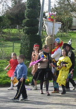 rues du village, Sa Majesté en tête, suivie d'une sympathique et